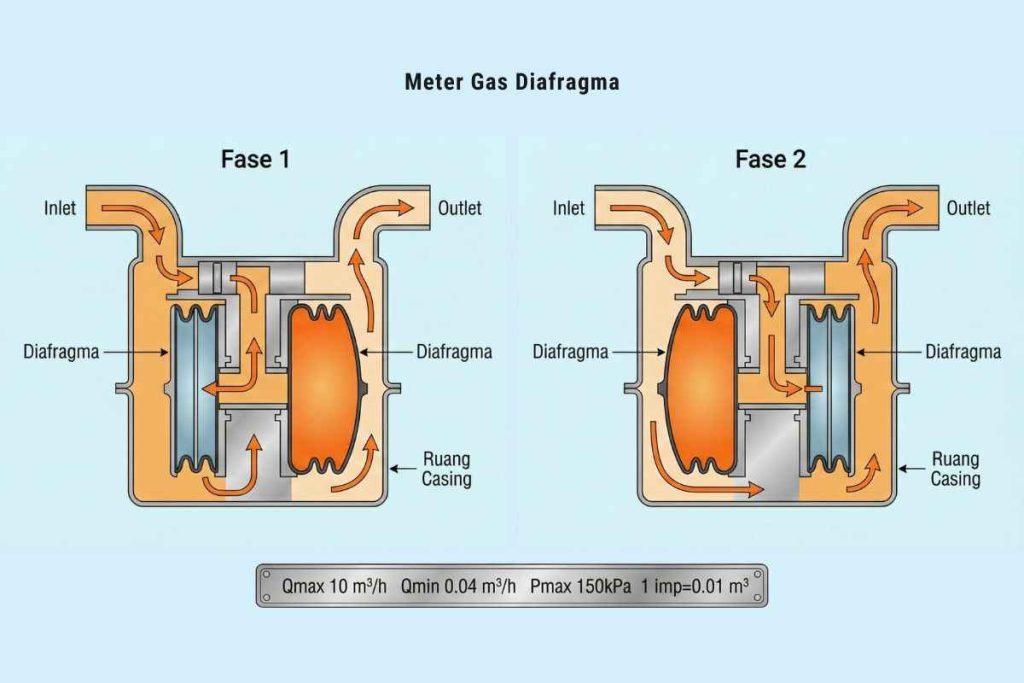 - Cara Kerja: Air yang mengalir menabrak impeller atau turbine, yang kemudian memutar register penghitung volume.